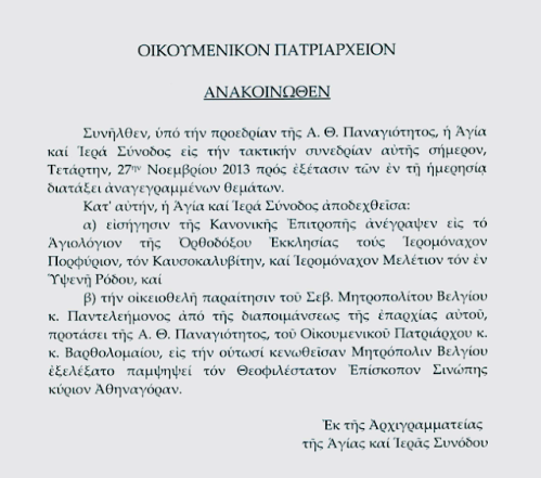 Ειδικότερα, η Ιερά Σύνοδος του Οικουμενικού Πατριαρχείου...